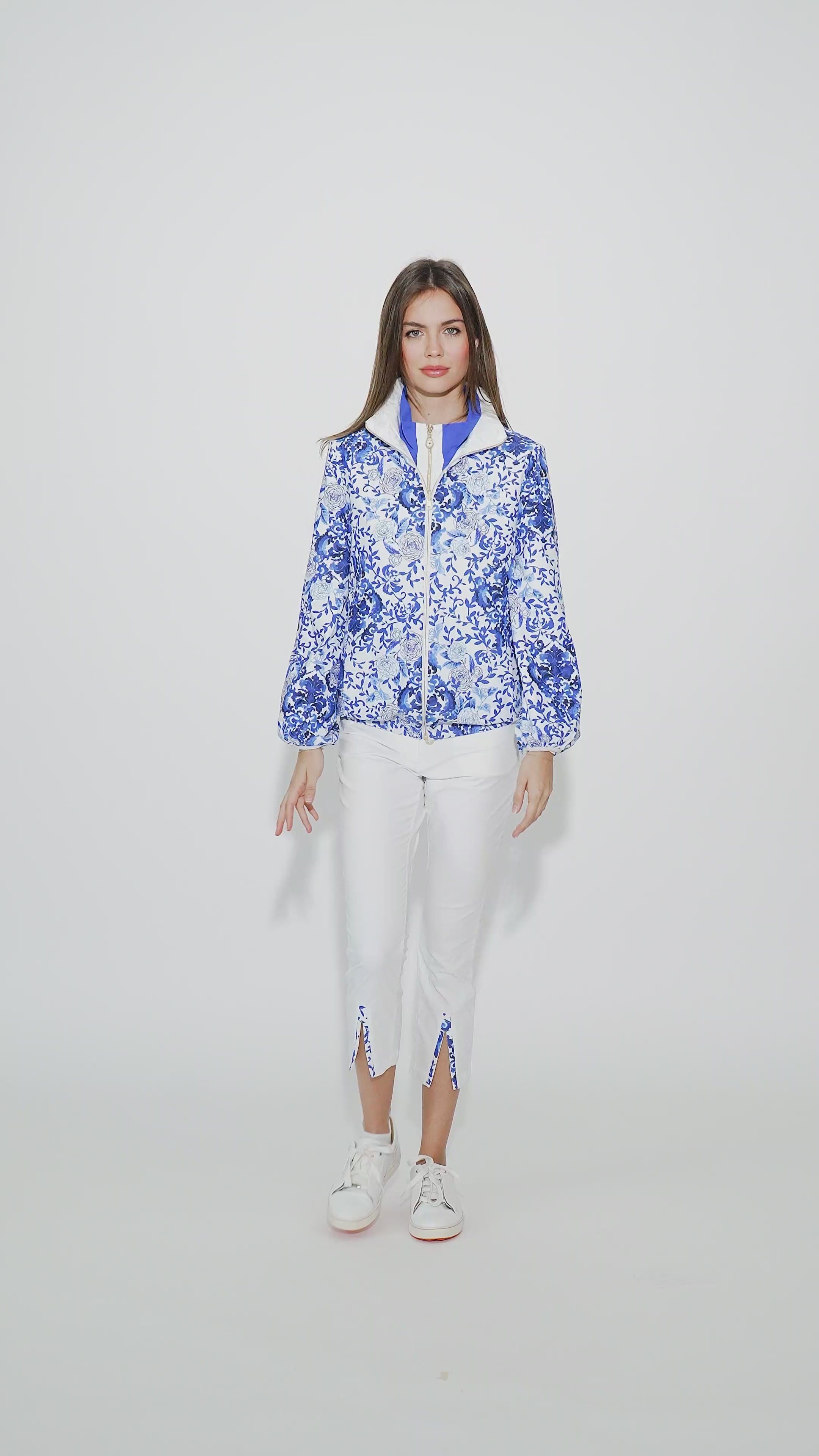 Our Reversible Nylon Windbreaker Jacket, a versatile outerwear piece designed for both style and functionality. Crafted from durable nylon, this jacket features a chic reversible design, allowing you to switch between a classic nylon outer material and a vibrant Lycra printed Medallion Blue print. The Riri 2-way Coil metal zipper in gold with a Swarovski crystal puller detail adds a touch of luxury to the design. Perfect for adding versatility to your wardrobe, this jacket is a must-have for any season.