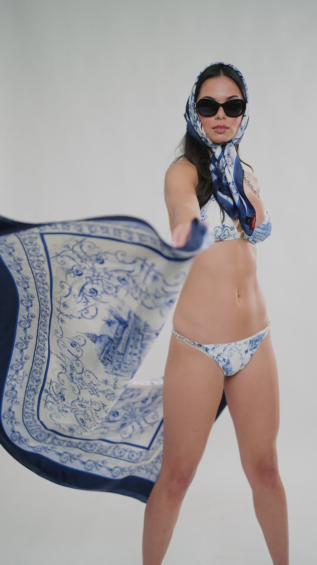Get ready to fall head over heels for our gorgeous Capri Triangle Top in the dreamy Venezia Print! This stunning piece is like wearing a little piece of Venice wherever you go Introducing our elegantly beautiful Capri ring Triangle Top in our exclusive Venezia Print. Inspired by the stunning city of Venezia, this top features our exclusive designer print curated by our Creative director Christina Brendratti, offering a conceptual design featuring aluminum chain detailing to mimic the rope tie for the boats in Venezia. Made in Italy with Eco-lycra, this top also includes removable soft cups for customizable support. Elevate your swimwear with this luxury piece.