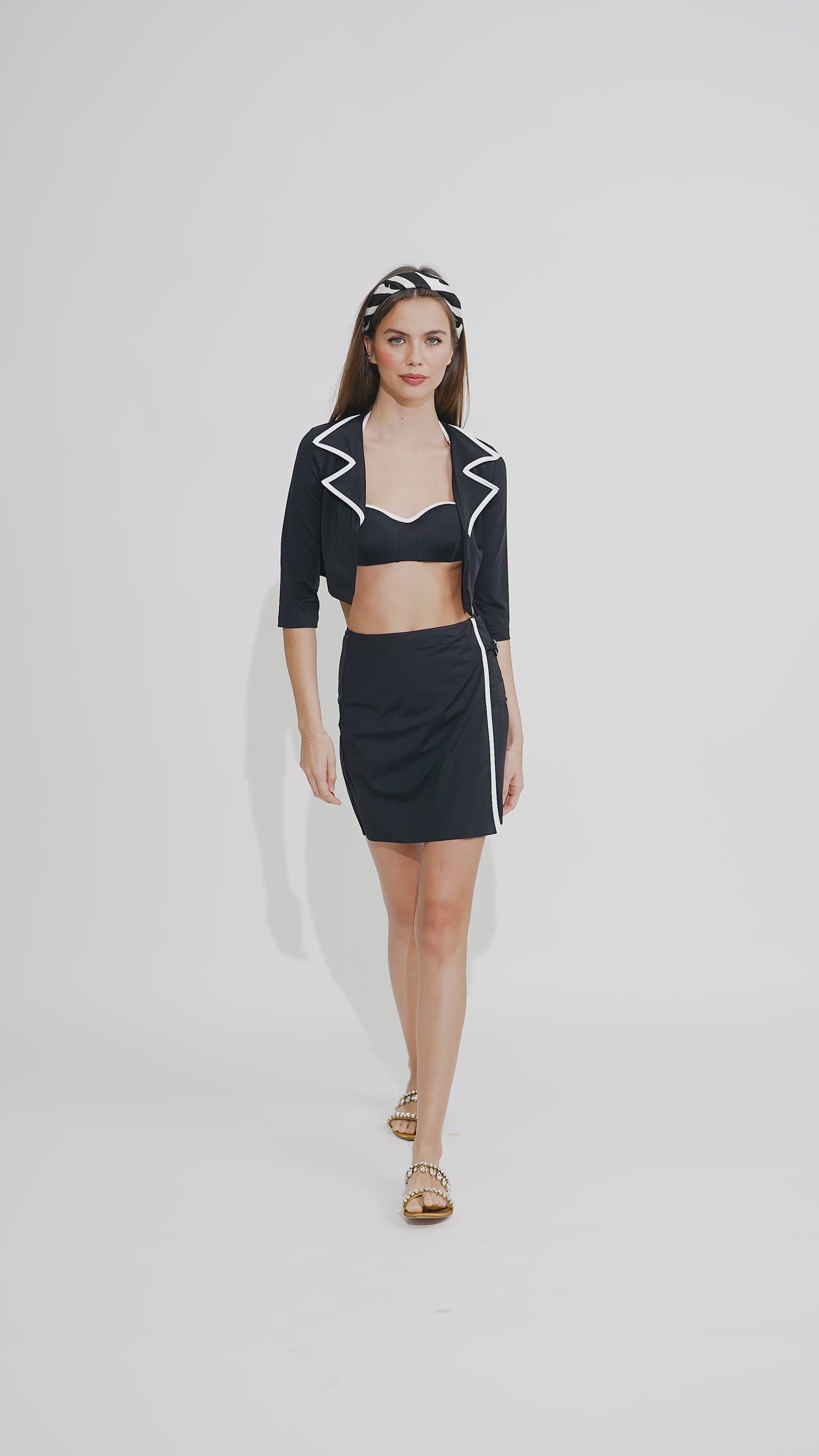 Indulge in our iconic Ravenna Bolero Jacket, featuring a timeless color combination of black and white, exuding elegance and sophistication. This must-have piece is tailored with 3/4 sleeves, perfect for the fashionably refined woman.