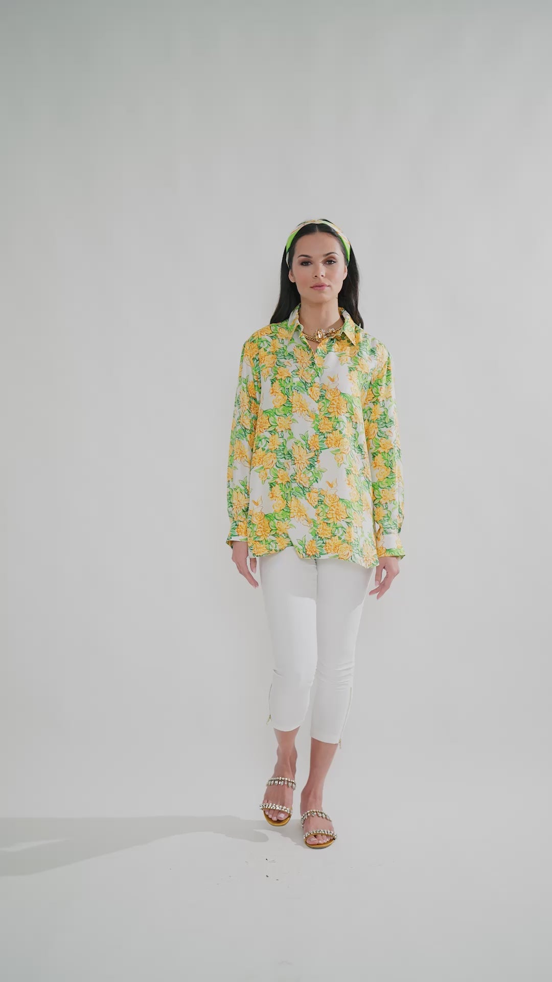 Indulge in luxury with our Ischia Italian Silk twill Blouse. Crafted in-house from the finest Italian silk and then printed in-house exclusively for Brendratti. Meticulously designed by our Creative director, It boasts a stunning Fiore plaster print in vibrant yellow and green tones. Perfect for dressing up for a night out or adding a touch of elegance to your everyday wardrobe. La dolce vita awaits.