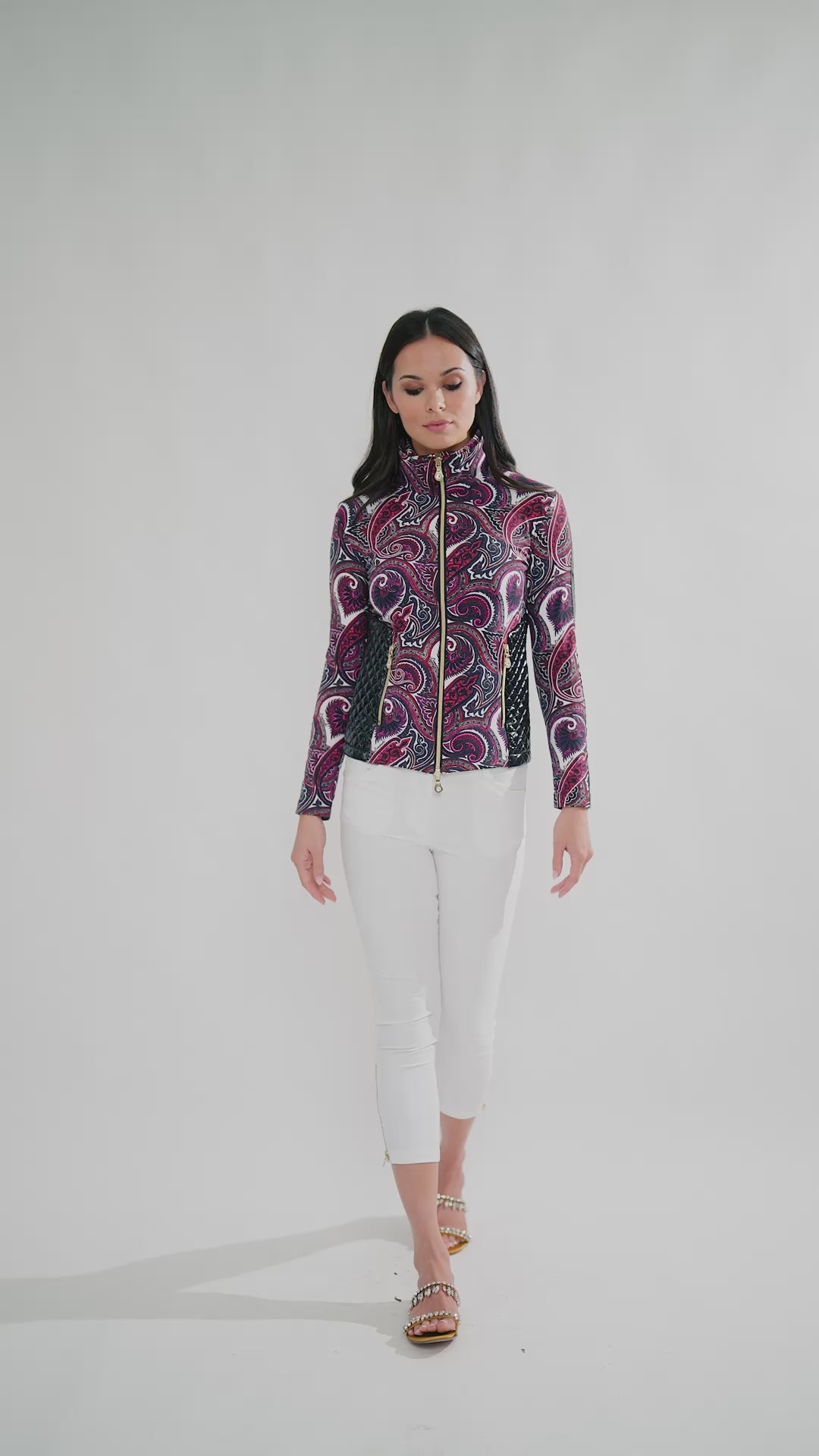 Introducing our Lido Jersey Layering jacket, crafted from luxurious Italian Sun Protective jersey. This elegant piece features quilted side panels in glossy Italian recycled nylon and showcases our exclusive hand painted Paisley Hearts print, curated by Brendratti, made in Italy. Elevate your wardrobe with this sophisticated and unique addition.