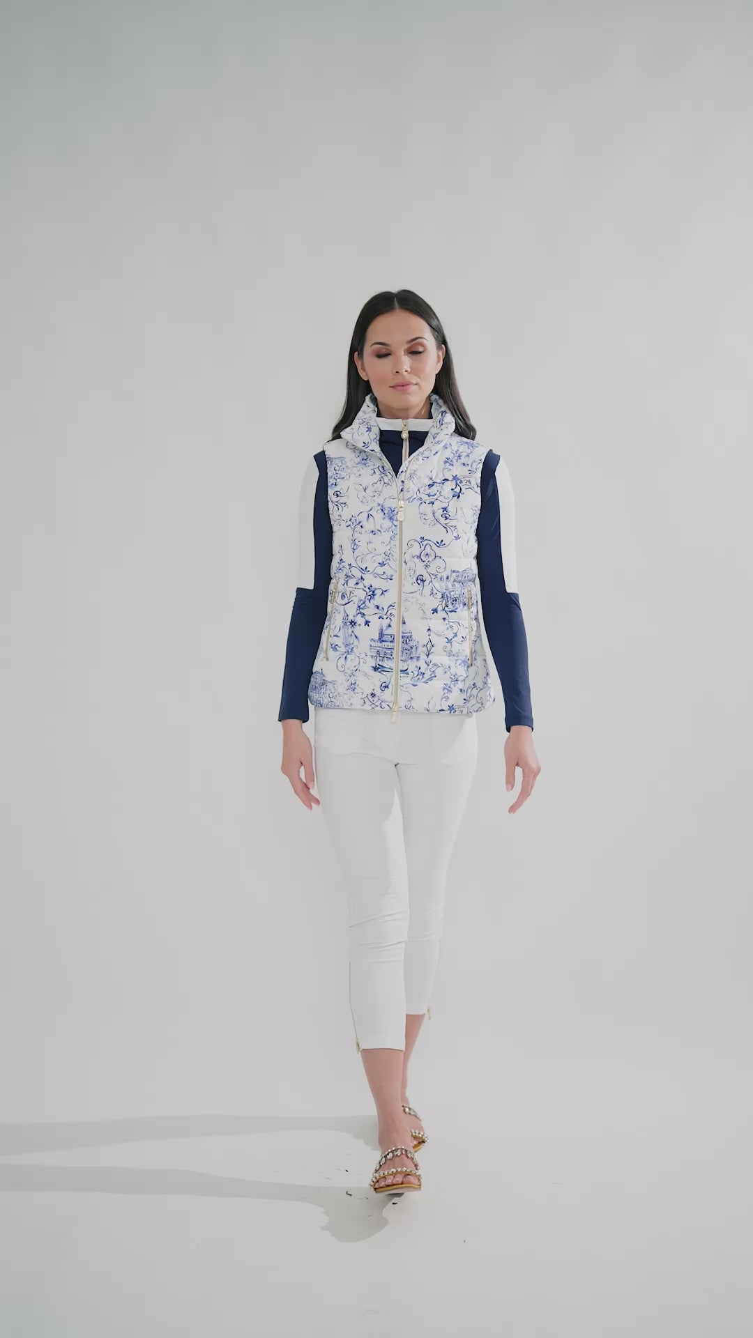 Experience the epitome of sophistication and luxury with our Luciana Down Vest, featuring recycled Milano eco-down and adorned in our exclusive Venezia-inspired designer print. The print includes elements of St. Mark's Square and St. Cecilia Church, paired with intricate floral and gate designs from Venetian architecture. The blue and white color scheme evokes the serenity of water, expertly crafted by our visionary creative director, Christina Brendratti, in Italy. Pair with Your Swimsuit in the Venetian Print or shorts to wear along the elegant Beach cities of your favorite resort.