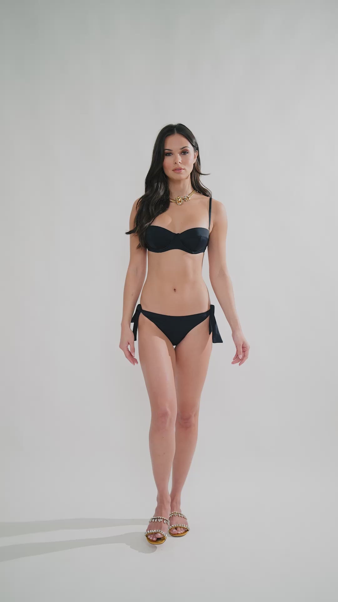 Our Chic Tie Side Bikini Bottom In Black is the epitome of designer chic. Crafted exclusively in Italy, with its wide tie side design, this bottom adds a touch of luxury to your beach ensemble. Crafted from soft Italian black Lycra that is carefully recycled, and complements any look with effortless sophistication. Stunning gold hardware and closure sourced in Italy, this bikini bottom is meticulously made and exudes luxury and style. Sun protective fibers offer 50+ UV Protection. Elevate your poolside attire with this timeless piece, designed and Made In Italy